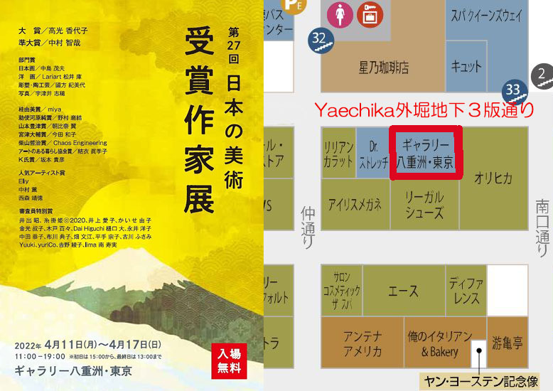 第27回日本の美術 受賞作家展 Yaechika 2022.04.13 2022年4月11日(月)から17日(日)まで、ギャラリー八重洲・東京に於いて、「第27回日本の美術 受賞作家展」が開催されます。「アートのある暮らし協会賞」受賞作家としての出品です。東京駅八重洲地下街Yaechikaの外堀地下3版通りで仲通りと南口通りの中間になります。 第9回みやぎの力 アート&クラフトフェア」 出展 前の記事 「アートのある暮らし協会賞」受賞 次の記事